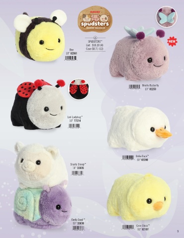 SPUDSTERS ™ NEW List $10.20 (4) Bee Case $8.71 (12) 10” 82081 Brielle Butterfly 10” 82253 Lori Ladybug ™ 10” 77214 Delia Duck ™ 10” 82200 Sharla Sheep ™ 10” 33835 Emily Snail ™ 10” 33838 Cece Chick ™ 10” 82197 9 9