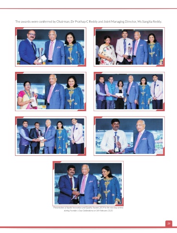The awards were conferred by Chairman, Dr Prathap C Reddy and Joint Managing Director, Ms Sangita Reddy. Presentation of Apollo Innovation and Quality Awards 2019 to the winning centres during Founder`s Day Celebrations on 5th February 2020 28