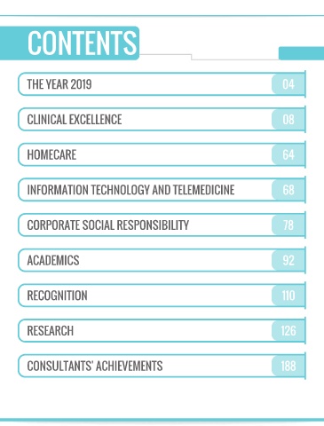 CONTENTS THE YEAR 2019 04 CLINICAL EXCELLENCE 08 HOMECARE 64 INFORMATION TECHNOLOGY AND TELEMEDICINE 68 CORPORATE SOCIAL RESPONSIBILITY 78 ACADEMICS 92 RECOGNITION 110 RESEARCH 126 CONSULTANTS' ACHIEVEMENTS 188