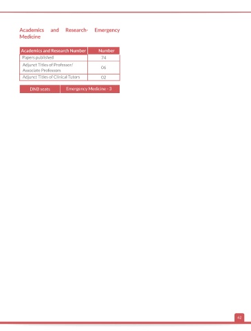 Academics and Research- Emergency Medicine Academics and Research Number Number Papers published 74 Adjunct Titles of Professor/ Associate Professors 06 Adjunct Titles of Clinical Tutors 02 DNB seats Emergency Medicine - 3 62