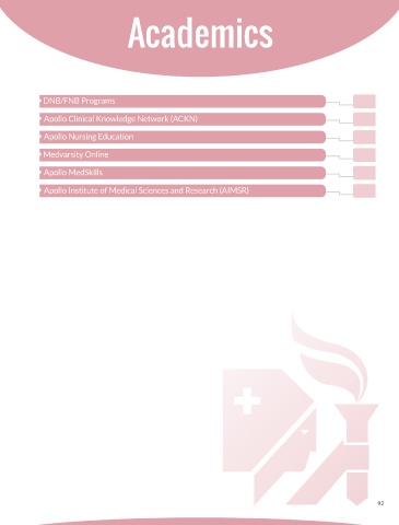 Academics DNB/FNB Programs Apollo Clinical Knowledge Network (ACKN) Apollo Nursing Education Medvarsity Online Apollo MedSkills Apollo Institute of Medical Sciences and Research (AIMSR) 92