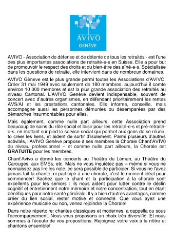 chante « Gloria » de Vivaldi, « Fantaisie Chorale » de L.V. Beethoven et la « Messa en ut mineur » niveau Cantonal. L’AVIVO Genève devient indispensable, souvent de