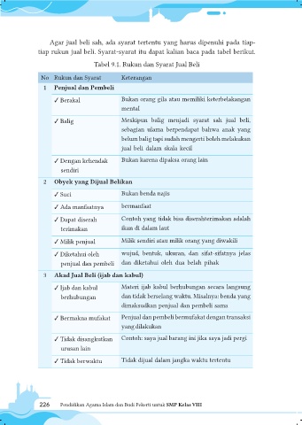 tiap rukun jual beli. Syarat-syarat itu dapat kalian baca pada tabel berikut.