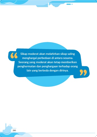 Sikap moderat akan melahirkan sikap saling menghargai perbedaan di antara sesama. Seorang yang moderat akan tetap memberikan penghormatan dan penghargaan terhadap orang lain yang berbeda dengan dirinya. 280