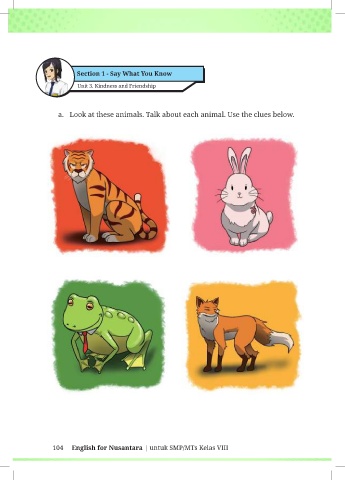 Section 1 - Say What You Know Unit 3. Kindness and Friendship a. Look at these animals. Talk about each animal. Use the clues below. 104 English for Nusantara | untuk SMP/MTs Kelas VIII