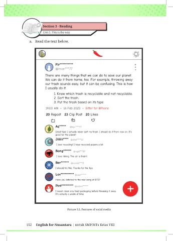 Section 3 - Reading Unit 2. This is the way a. Read the text below. Picture 3.2. Features of social media 152 English for Nusantara | untuk SMP/MTs Kelas VIII