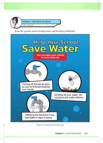 Section 1 - Say What You Know Unit 3. Act now Read the posters about saving water and donating old books. Picture 3.4. Poster about saving water Chapter 3 | Love Our World 163