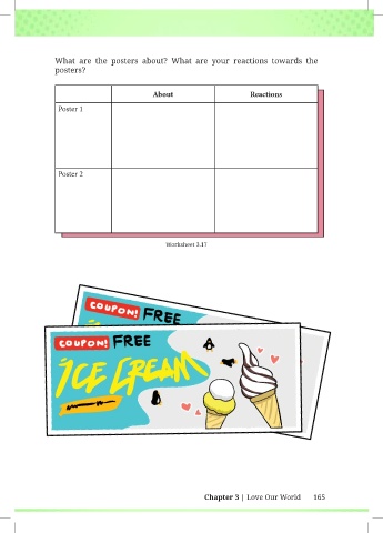 What are the posters about? What are your reactions towards the posters? About Reactions Poster 1 Poster 2 Worksheet 3.17 Chapter 3 | Love Our World 165