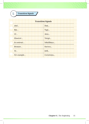 I. I. Transition Signals Transition Signals And… Dan… But… Tapi… Or… Atau… However… Tetapi… In contrast… Sebaliknya… Because… Karena… So… Jadi… For example… Contohnya… Chapter 0 | The Beginning 15