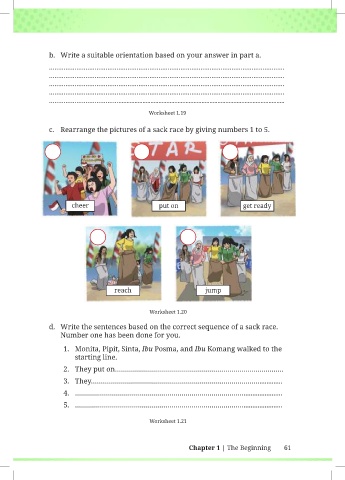 d. Write the sentences based on the correct sequence of a sack race.