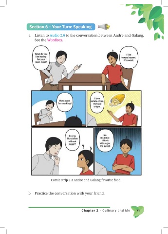 Section 6 – Your Turn: Speaking a. Listen to Audio 2.6 to the conversation between Andre and Galang. See the Wordbox. Comic strip 2.3 Andre and Galang favorite food. b. Practice the conversation with your friend. Chapter 2 - Culinary and Me 71
