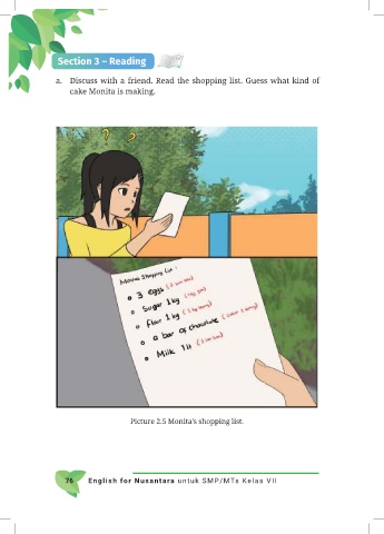 Section 3 – Reading a. Discuss with a friend. Read the shopping list. Guess what kind of cake Monita is making. Picture 2.5 Monita’s shopping list. f 76 English or Nusantara untuk SMP/MTs Kelas VII