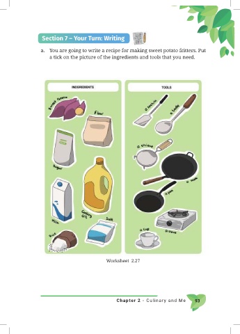 Section 7 – Your Turn: Writing a. You are going to write a recipe for making sweet potato fritters. Put a tick on the picture of the ingredients and tools that you need. Worksheet 2.27 Chapter 2 - Culinary and Me 93
