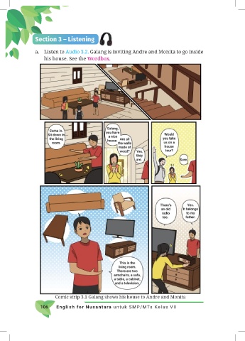 Section 3 – Listening a. Listen to Audio 3.2. Galang is inviting Andre and Monita to go inside his house. See the Wordbox. Comic strip 3.1 Galang shows his house to Andre and Monita f 106 English or Nusantara untuk SMP/MTs Kelas VII