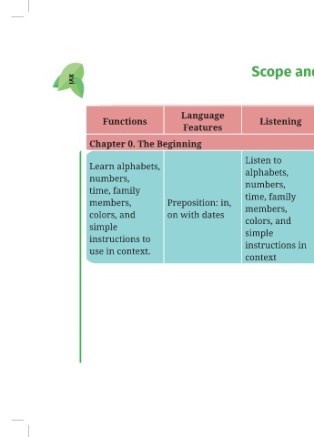Functions Chapter 0. The Beginning Learn alphabets, numbers, time, family members, colors, and simple instructions to use in context.