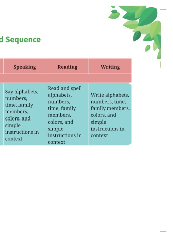 Listening Listen to alphabets, numbers, time, family members, colors, and simple instructions in context