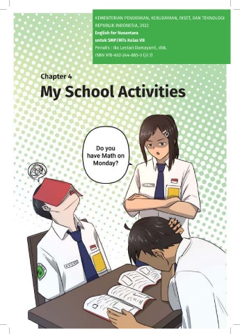 KEMENTERIAN PENDIDIKAN, KEBUDAYAAN, RISET, DAN TEKNOLOGI REPUBLIK INDONESIA, 2022 English for Nusantara untuk SMP/MTs Kelas VII Penulis : Ika Lestari Damayanti, dkk. ISBN 978-602-244-885-3 (jil.1) Chapter 4 My School Activities