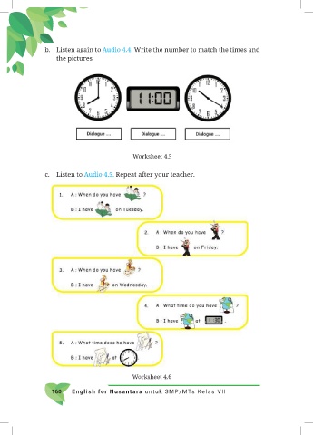 b. Listen again to Audio 4.4. Write the number to match the times and the pictures. Worksheet 4.5 c. Listen to Audio 4.5. Repeat after your teacher. Worksheet 4.6 160 English or Nusantara untuk SMP/MTs Kelas VII f