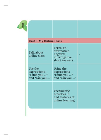 Verbs: be- airmative, negative, interrogative, short answers Using the expressions “could you …” and “can you …” Vocabulary: activities in and features of online learning
