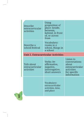 preposition of place: beside, behind, in front of, or across Vocabulary: rooms in a school, things in airmative, interrogative, short answers Vocabulary: extracurricular activities, time,