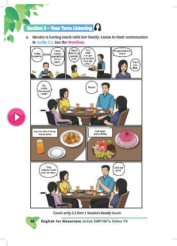 Section 3 – Your Turn: Listening a. Monita is having lunch with her family. Listen to their conversation in Audio 2.2. See the Wordbox. Comic strip 2.2 Part 1 Monita’s family lunch f 64 English or Nusantara untuk SMP/MTs Kelas VII