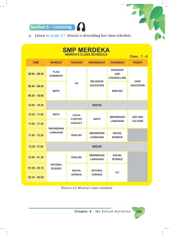 Section 5 – Listening a. Listen to Audio 4.7. Monita is describing her class schedule. Picture 4.2 Monita’s class schedule Chapter 4 - My School Activities 163