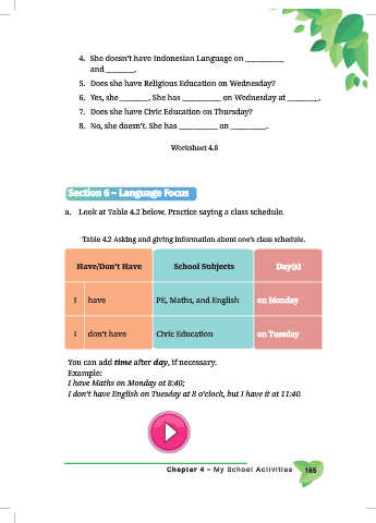 Table 4.2 Asking and giving information about one’s class schedule.