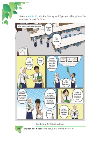 c. Listen to Audio 5.2. Monita, Galang, and Pipit are talking about the location of school facilities. Comic strip 5.2 School facilities f 208 English or Nusantara untuk SMP/MTs Kelas VII