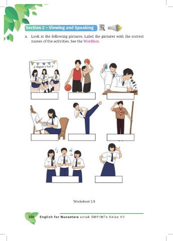 Section 2 – Viewing and Speaking a. Look at the following pictures. Label the pictures with the correct names of the activities. See the Wordbox. Worksheet 5.9 f 220 English or Nusantara untuk SMP/MTs Kelas VII