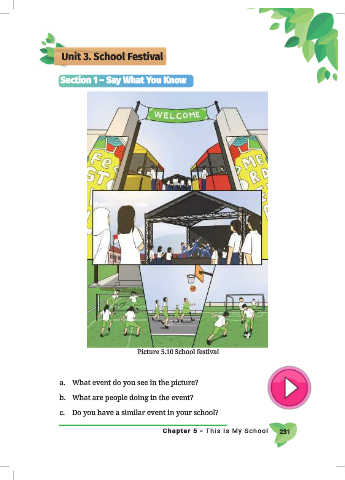 Unit 3. School Festival Section 1 – Say What You Know Picture 5.10 School festival a. What event do you see in the picture? b. What are people doing in the event? c. Do you have a similar event in your school? i Chapter 5 - This s My School 231