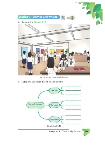 Section 4 – Viewing and Writing a. Look at the Picture 5.12 Picture 5.12 School exhibition b. Complete the chart based on the picture Worksheet 5.18 i Chapter 5 - This s My School 237