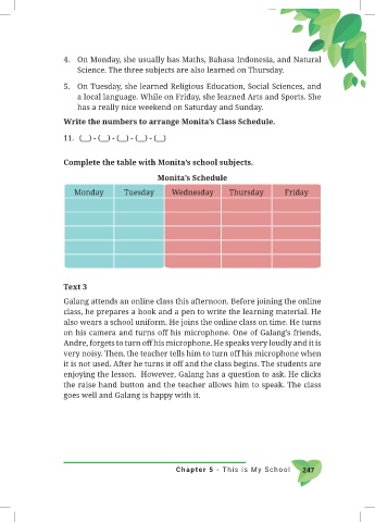 4. On Monday, she usually has Maths, Bahasa Indonesia, and Natural