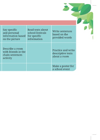 Write sentences based on the provided words Practice and write descriptive texts about a room Make a poster for a school event