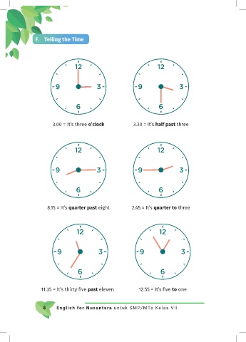 F. Telling the Time 3.00 = It’s three o’clock 3.30 = It’s half past three 8.15 = It’s quarter past eight 2.45 = It’s quarter to three 11.35 = It’s thirty ive past eleven 12.55 = It’s ive to one f 8 English or Nusantara untuk SMP/MTs Kelas VII