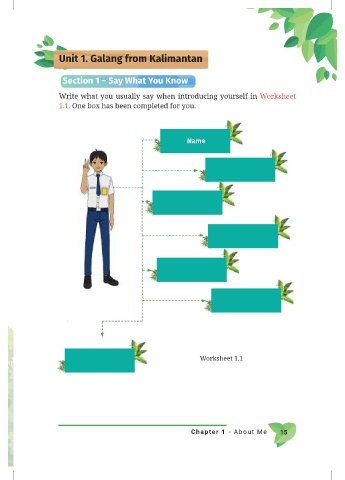 Unit 1. Galang from Kalimantan Section 1 – Say What You Know Write what you usually say when introducing yourself in Worksheet 1.1. One box has been completed for you. Name Worksheet 1.1 Chapter 1 - About Me 15