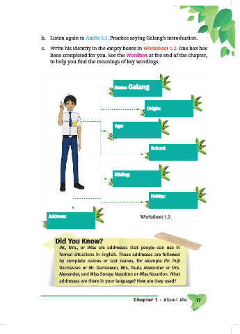 b. Listen again to Audio 1.1. Practice saying Galang’s introduction.