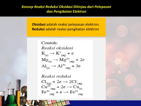 Konsep Reaksi Reduksi Oksidasi Ditinjau dari Pelepasan dan Pengikatan Elektron Oksidasi adalah reaksi pelepasan elektron. Reduksi adalah reaksi pengikatan elektron