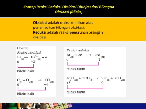 Konsep Reaksi Reduksi Oksidasi Ditinjau dari Bilangan Oksidasi (Biloks) Oksidasi adalah reaksi kenaikan atau penambahan bilangan oksidasi. Reduksi adalah reaksi penurunan bilangan oksidasi.