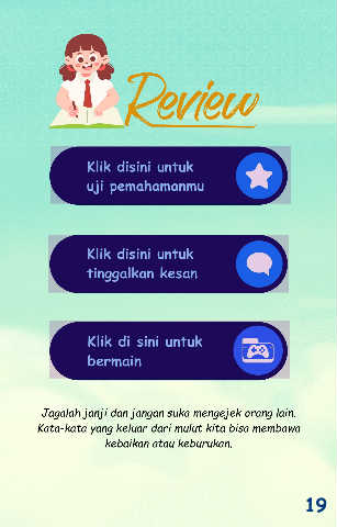Klik disini untuk uji pemahamanmu Klik disini untuk tinggalkan kesan Klik di sini untuk bermain Jagalah janji dan jangan suka mengejek orang lain. Kata-kata yang keluar dari mulut kita bisa membawa kebaikan atau keburukan. 19
