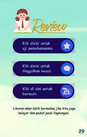 Klik disini untuk uji pemahamanmu Klik disini untuk tinggalkan kesan Klik di sini untuk bermain Liburan akan lebih bermakna jika kita juga belajar dan peduli pada lingkungan. 29