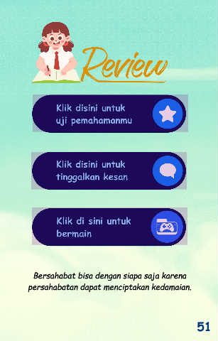 Klik disini untuk uji pemahamanmu Klik disini untuk tinggalkan kesan Klik di sini untuk bermain Bersahabat bisa dengan siapa saja karena persahabatan dapat menciptakan kedamaian. 51