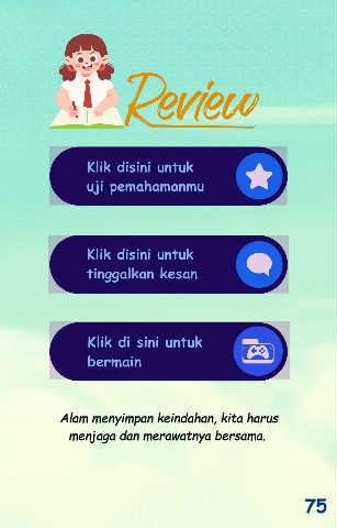 Klik disini untuk uji pemahamanmu Klik disini untuk tinggalkan kesan Klik di sini untuk bermain Alam menyimpan keindahan, kita harus menjaga dan merawatnya bersama. 75