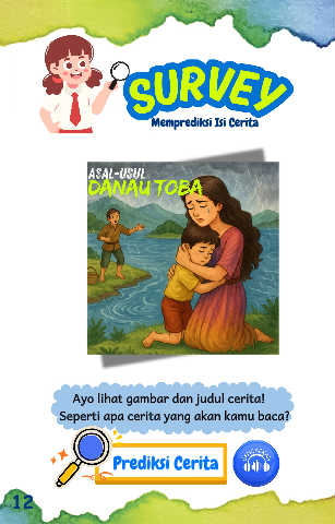 R S U V E S U R V E Y Y Memprediksi Isi Cerita asal-usul danau toba Ayo lihat gambar dan judul cerita! Seperti apa cerita yang akan kamu baca? Prediksi Cerita DENGARKAN 12