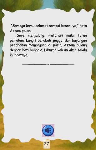 “Semoga kamu selamat sampai besar, ya,” kata Azzam pelan. Sore menjelang, matahari mulai turun perlahan. Langit berubah jingga, dan bayangan pepohonan memanjang di pasir. Azzam pulang dengan hati bahagia. Liburan kali ini akan selalu ia ingatnya.