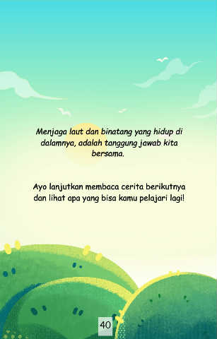 Menjaga laut dan binatang yang hidup di dalamnya, adalah tanggung jawab kita bersama. Ayo lanjutkan membaca cerita berikutnya dan lihat apa yang bisa kamu pelajari lagi!