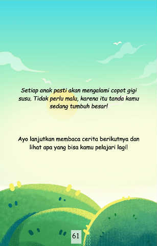 Setiap anak pasti akan mengalami copot gigi susu. Tidak perlu malu, karena itu tanda kamu sedang tumbuh besar! Ayo lanjutkan membaca cerita berikutnya dan lihat apa yang bisa kamu pelajari lagi!