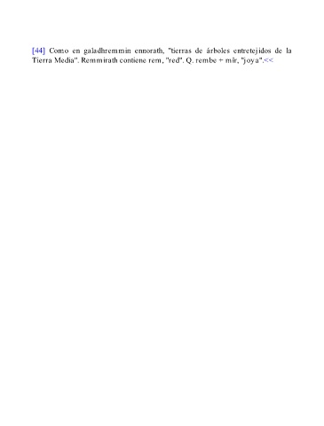 [44] Como en galadhremmin ennorath, "tierras de árboles entretejidos de la Tierra Media". Remmirath contiene rem, "red". Q. rembe + mîr, "joya".<<