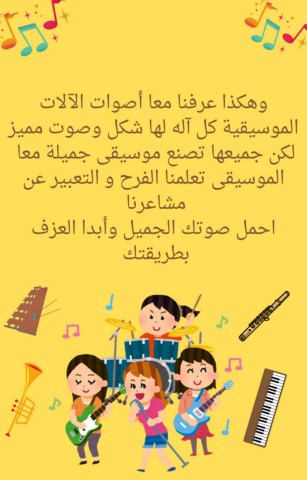 وهكذا عرفنا معا أصوات الآلات الموسيقية كل آله لها شكل وصوت مميز لكن جميعها تصنع موسيقى جميلة معا الموسيقى تعلمنا الفرح و التعبير عن مشاعرنا احمل صوتك الجميل وأبدا العزف بطريقتك