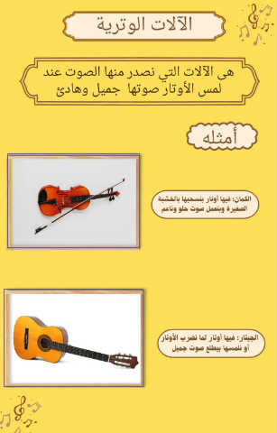 الآلات الوترية هى الآلات التي نصدر منها الصوت عند لمس الأوتار صوتها جميل وهادئ أمثله الكمان :فيها أوتار بنسحبها بالخشبة الصغيرة وبتعمل صوت حلو وناعم الجيتار :فيها أوتار لما نضرب الأوتار أو نلمسها بيطلع صوت جميل