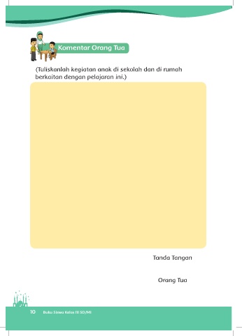 Komentar Orang Tua (Tuliskanlah kegiatan anak di sekolah dan di rumah berkaitan dengan pelajaran ini.) Tanda Tangan Orang Tua 10 Buku Siswa Kelas III SD/MI